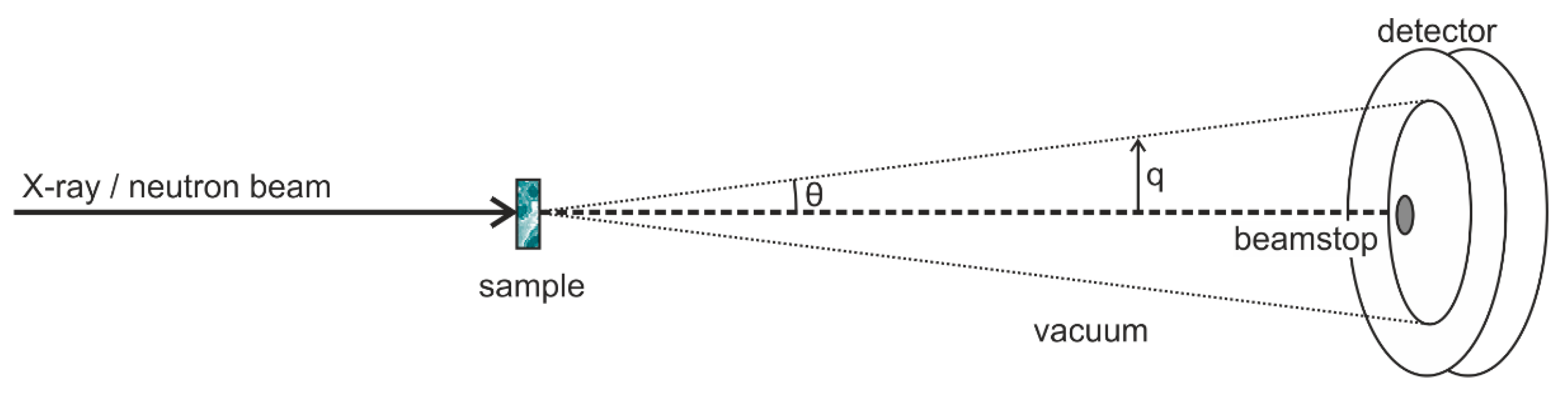 Small-angle X-ray and neutron scattering (SAXS and SANS, respectively) measurements are conceptually very simple and the basic principles are similar to those of light scattering, which is now routinely used in biological and pharmaceutical labs to estimate the size distribution of formulations with particles in the submicron domain [1]. Though there are common underlying principles and methods for extracting structural information from X-ray or neutron scattering data, there are fundamental differences in the way X-rays and neutrons are produced and how they interact with the scattering medium [2,3,4]. In the case of X-rays, the scattering originates from electrons, and it is nearly independent of the incident wavelength, except in the close vicinity of the absorption edge of the constituent elements. In the latter case, the technique offers an opportunity for contrast variation measurements [2,5], as will be illustrated in Section 2.2. Figure 1 shows the scattering geometry of a conventional SAXS and SANS experimental setup [6]. In the case of a synchrotron X-ray source, a highly collimated and monochromatic beam impinges on a sample and the scattered intensity in the forward direction is collected by a two-dimensional detector. The transmitted primary beam is fully absorbed by a beamstop placed in front of the detector, and the flight path before and after the sample is commonly in vacuum in order to avoid absorption and scattering by air. In modern instruments, the beamstop is often equipped with intensity monitors to record the transmission simultaneously with the scattering pattern. Subsequently, the two-dimensional scattering pattern is radially integrated to provide the one-dimensional scattering function I(q), where q is the length of the scattering vector (i.e., the momentum transfer), defined by q, λ being the incident wavelength (typically of the order ~1 Å) and θ the scattering angle. The scattering vector q provides the length scales probed by the experiment. X-ray scattering can give information over a wide range of scattering angles from ultralow angles (USAXS), small angles (SAXS), and wide angle (WAXS) [2,3]. In modern synchrotron SAXS instruments [7] the q range can ultimately cover more than four orders of magnitude, 0.001 nm−1 < q < 50 nm−1, corresponding to real space dimensions from the µm down to the nm range (Figure 2a). Reviews of experimental aspects of the technique and descriptions of the different types of instruments for X-ray scattering can be found elsewhere [3,6,8,9].