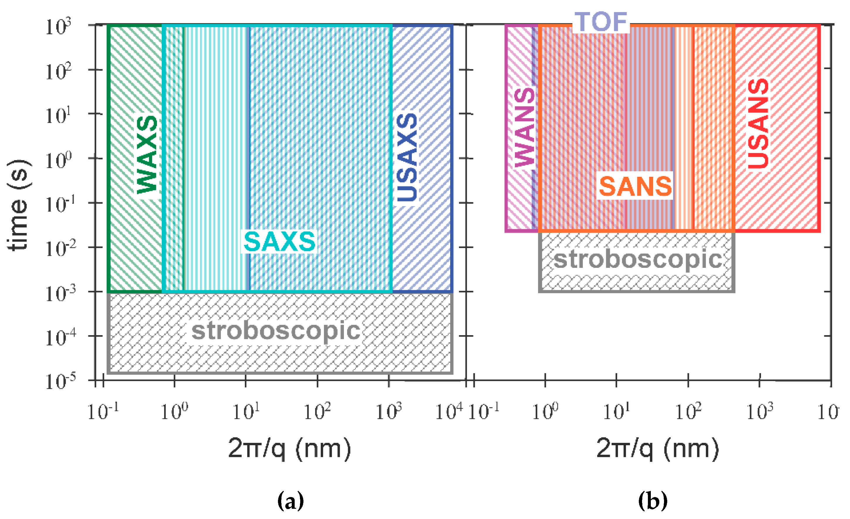 Time and length scale provided by small-angle X-ray and neutron scattering experiments (panel (a) and (b), respectively).
