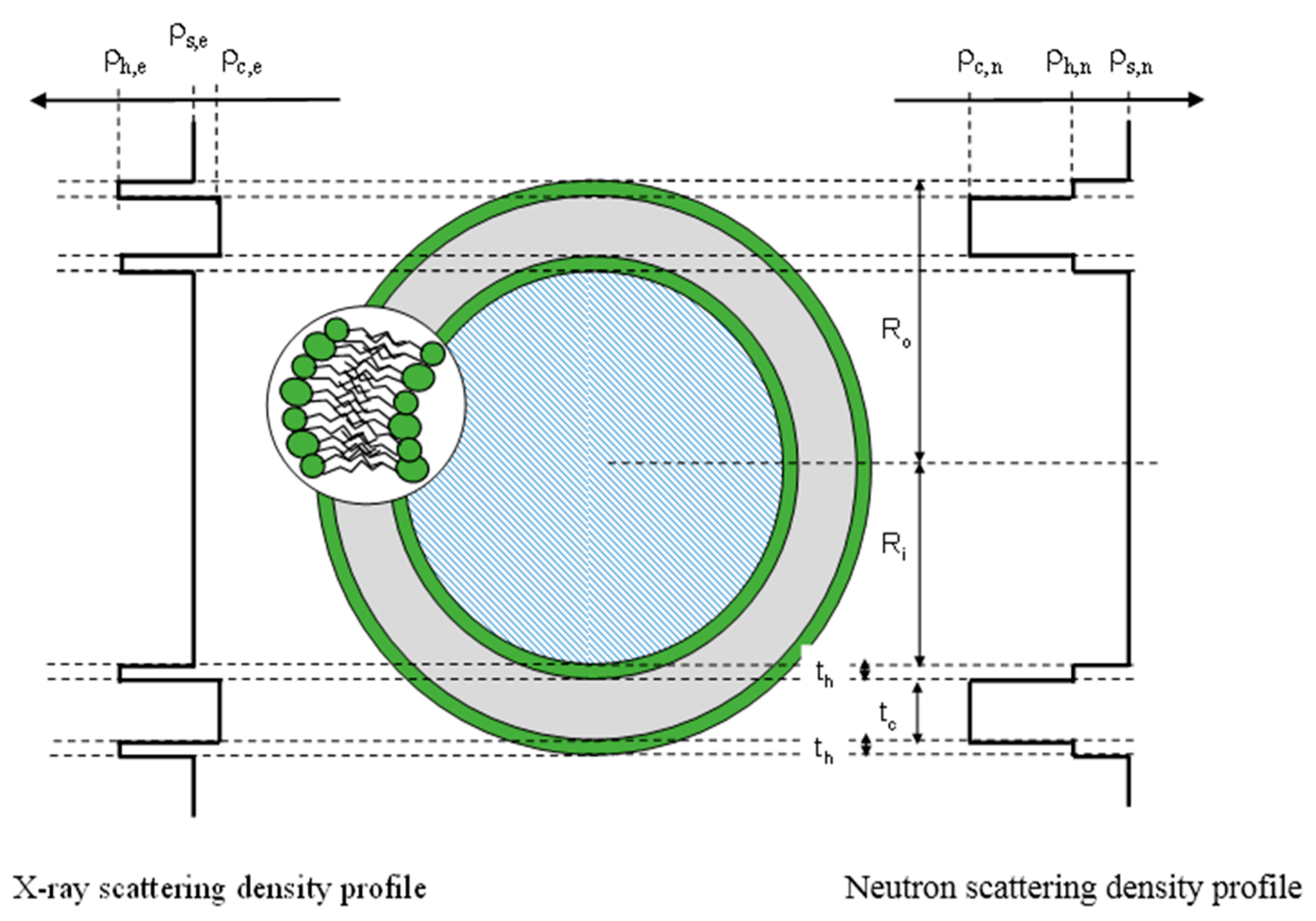 Comparison of the scattering length density profile of liposome for X-ray (left) and neutron (right). Adapted from [11].