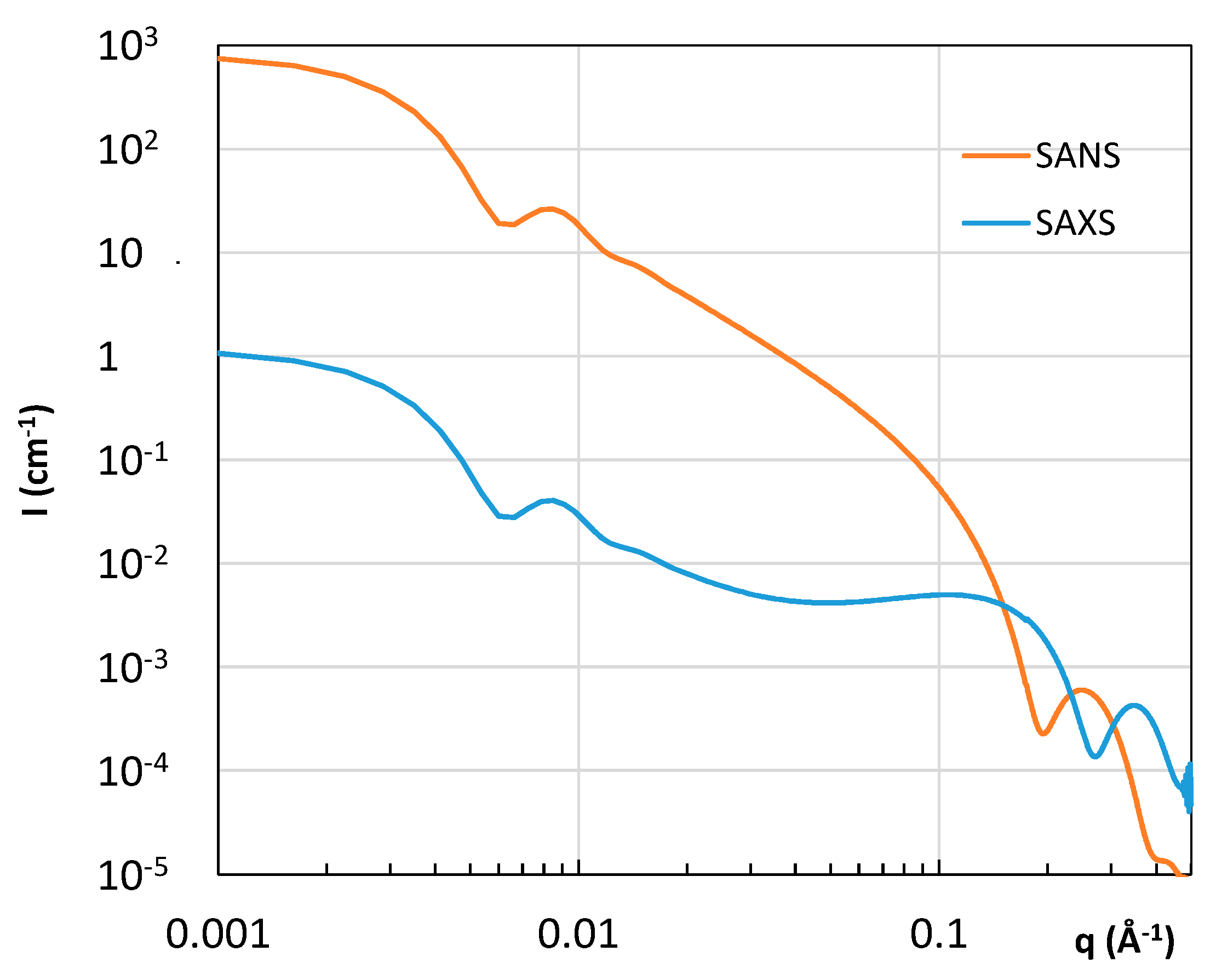Calculated small-angle X-ray scattering (SAXS) and small-angle neutron scattering (SANS) intensity for a suspension of 1% of liposomes. The SLD profile is shown in Figure 3. Ri = 450 Å, th = 5.4 Å; tc = 28 Å; ρh,n = 3.5 × 1010 cm−2; ρc,n = −0.208 × 1010 cm−2; ρs,n = 6.4 × 1010 cm−2; ρh,e = 13.2 × 1010 cm−2; ρc,e = 7.6 × 1010 cm−2; ρs,e = 9.33 × 1010 cm−2.