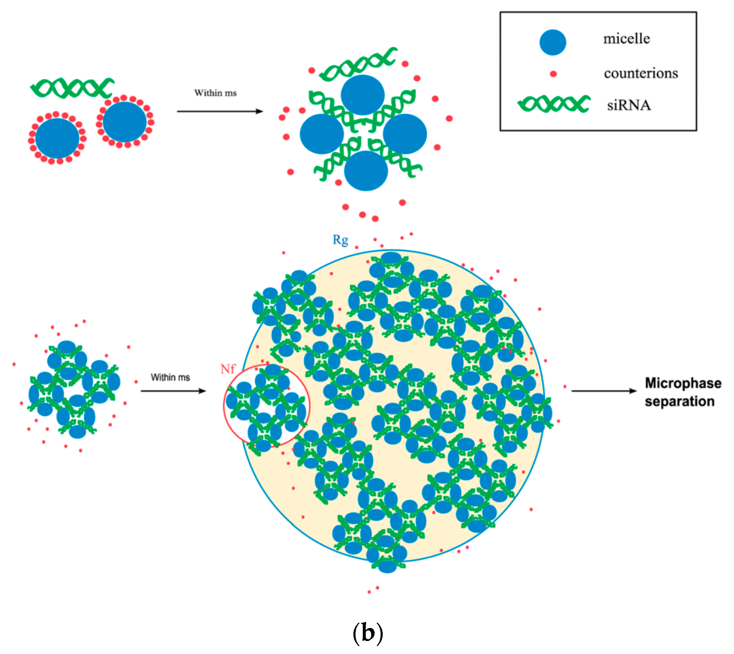 (a) Time evolution of the number of correlated layers in small interfering RNA (siRNA)/micelle complexes for surfactants 12-6-12 and SH14 at two different concentrations, for charge ratio CR = 1.25. (b) Schematic of the pathway of complex formation. (Reproduced from [56]. Copyright RSC 2014).