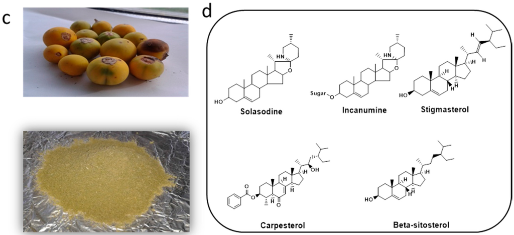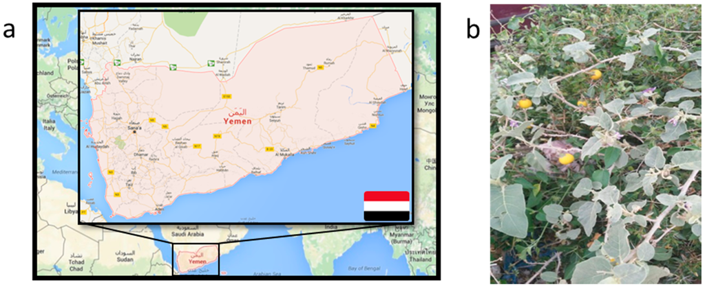 Figure 1. (a) Map of Yemen Republic indicating the area for the collection of the Jericho tomato; (b) This particular tomato represents a widespread agricultural weed rich in many biologically active substances. Although it is readily available across large regions of the Middle East and sub-Saharan Africa, it cannot be processed adequately in those countries and hence is of no particular use so far; (c) Dried fruits of S. incanum can be ground easily to form a green, powder-like material which in itself cannot be applied in practice. It can be processed further, for instance by extraction with organic solvents or via nanosizing; (d) Some of the main phytochemicals found in S. incanum which are considered to be responsible for its activity.