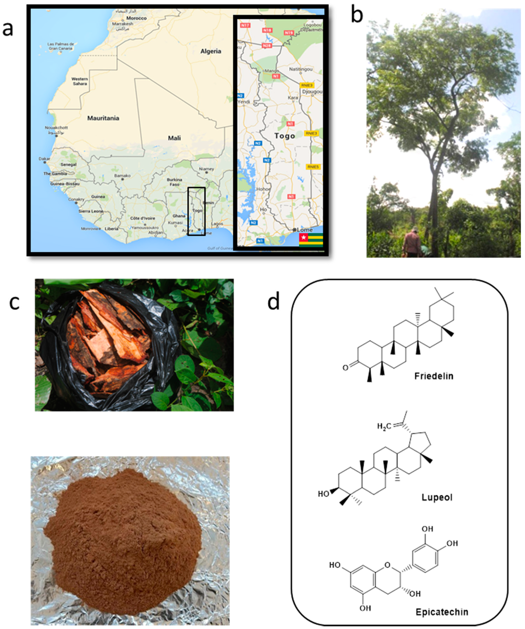 P. erinaceus, an abundant non-endangered tree, was collected in Togo in the central part of the country (GPS coordinates: 09°11′689″ North, 001°15′942″ East) on the 19 June 2014 after a formal identification by a botanist (Figure 2). Voucher specimens have been deposited at the Herbarium of the University of Lomé, Togo, with a voucher number TOGO-15077. The fresh plant material was brought to the Laboratory of Botany and Plants Ecology (University of Lomé, Togo, BP: 1515) where it was dried at 25 °C. After drying, the relevant material was ground to yield the raw material, as shown for instance in Figure 2c. These raw powders were sealed and subsequently used for further scientific investigations.