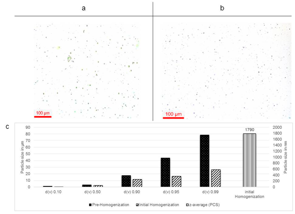 Figure 3. (a) Microscopic examination of the pre-homogenized sample of the fruit of S. incanum (200-fold magnification); (b) The same sample after initial HPH up to 1000 bar pressure; (c) Characterization of the samples of S. incanum at different stages of homogenization. Here, initial homogenization was sufficient to generate particles with diameters below 2 µm (see (b)), whereas further HPH at 1500 bar resulted in samples prone to aggregation (diameters above 2 µm, not shown).