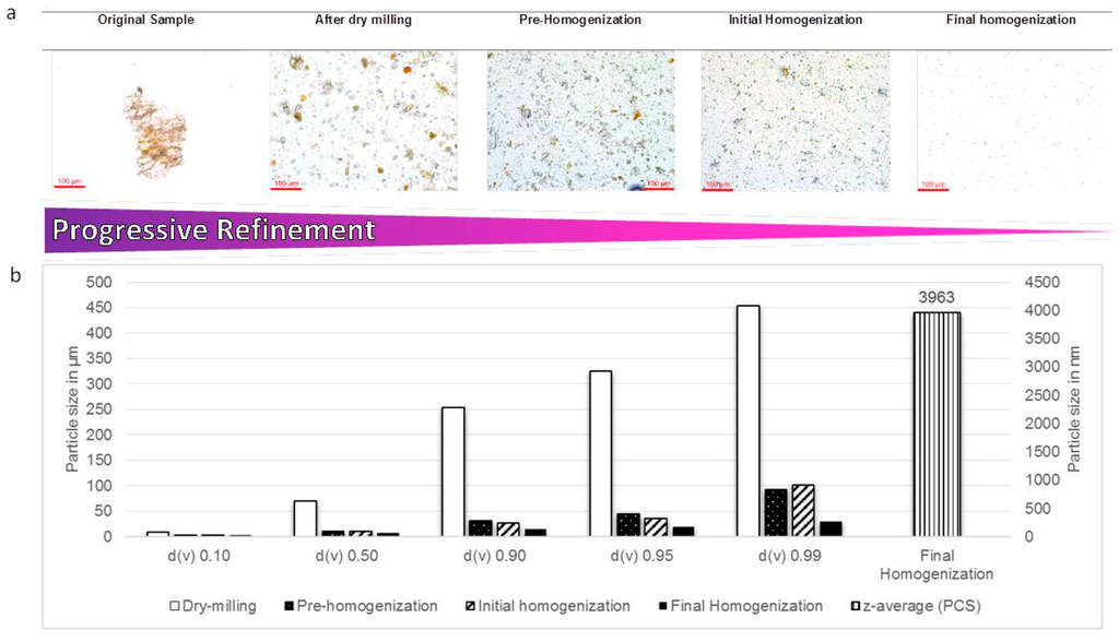 Figure 4. (a) Optical microscopy of sequentially processed bark of P. erinaceus, from the crude plant material ground down with a simple coffee grinder at the University of Lomé in Togo on the left to initially and finally homogenized materials on the right (200-fold magnification); (b) LD and PCS analysis of the different samples confirming a progressive refinement of the particles to a final average particle size of just below 4 µm achieved by HSS and subsequent HPH.