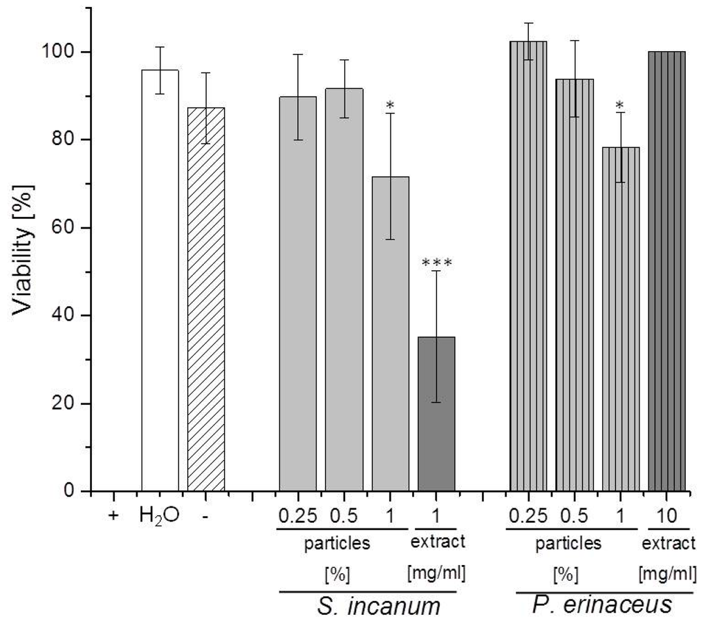 Figure 5. Activity of particle suspensions and methanolic extracts of S. incanum and P. erinaceus against the nematode S. feltiae. Experimental details are provided in the text. Negative controls (H2O) and Plantacare 1% (−) and a positive control (+) of 70% ethanol were used. Experiments were performed in triplicate and on at least two different occasions. Statistical significances were calculated using one-way ANOVA (OriginPlus). * p < 0.05, *** p < 0.005.