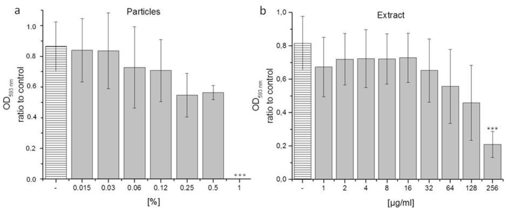 Whilst it appears that the particles of S. incanum—when compared to the ones of P. erinaceus—are more active against S. feltiae, the latter display an interesting activity against E. coli (Figure 6). Unlike the particles of the Jericho tomato, which are inactive against E. coli, the particles as well as the extracts of the P. erinaceus reduce the survival of this Gram-negative bacterium in a concentration-dependent and statistically significant manner (E. coli was chosen here as intestinal and generally fairly resistant bacterial target). At a particle concentration of 1%, for instance, the bacterial count is reduced to zero when compared to the negative control (water), whilst the stabilizer Plantacare at those concentrations exhibited no significant impact on bacterial growth (data not shown). This finding is in agreement with the pronounced activity of the processed methanolic extract of the bark of P. erinaceus, which also reduced bacterial growth from an OD593 of 0.8 in the control to just 0.2 (i.e., to around 25% of the original growth), when employed at a concentration of 256 µg·mL−1. As in the case of S. incanum and its activity against S. feltiae, the particle preparations on the one side, and the dissolved extracts on the other, are not directly comparable for several reasons. Still, it appears that processing the bark of P. erinaceus to small particles provides a viable method to “unlock” the biological activity of this material and hence to render it suitable to reduce the viability of certain bacteria, such as E. coli.