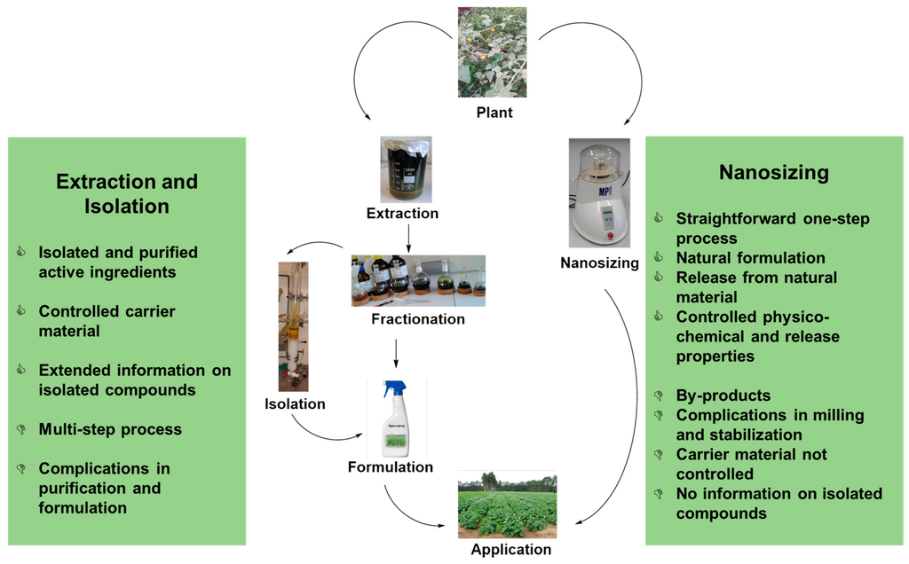 Eventually, comprehensive studies on the nanosizing techniques, the particles obtained and their respective biological activities, physico–chemical and release properties will decide if such methods indeed provide a viable alternative to the extraction, isolation, formulation and delivery methods traditionally employed to move from a crude plant material to a practical application. As nanosizing “in one go” covers all these conventional methods from extraction to formulation (Figure 7), and since our initial results are certainly not negative, it is definitely worthwhile to give such methods and the resulting particles further consideration.