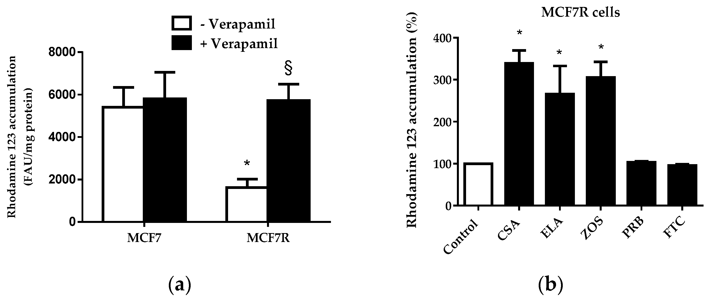 3.2. Rhodamine 123 Accumulation in MCF7 and MCF7R Cells