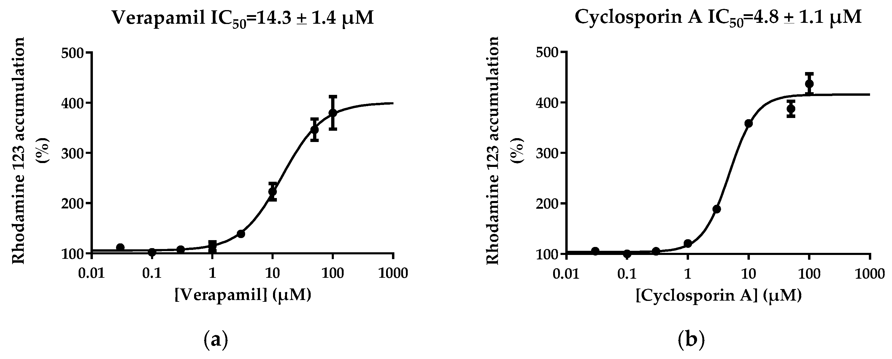 - Sarver, J.G.; Klis, W.A.; Byers, J.P.; Erhardt, P.W. Microplate screening of the differential effects of test agents on Hoechst 33342, rhodamine 123, and rhodamine 6G accumulation in breast cancer cells that overexpress P-glycoprotein. J. Biomol. Screen. 2002, 7, 29–34. [Google Scholar] [PubMed]