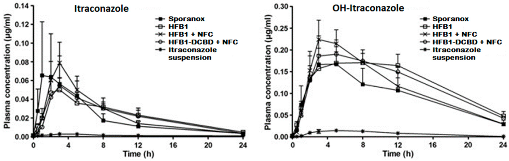 Plasma concentration–time profiles of itraconazole (left) and OH-itraconazole (right) in rats after oral administration of Sporanox®, three different hydrophobin coated nanocrystal formulations and itraconazole microsuspension in rats. AUC values for nanocrystal formulations were 1.2–1.3-fold higher than with Sporanox® (reprinted from [] with permission. Copyright Elsevier 2011).