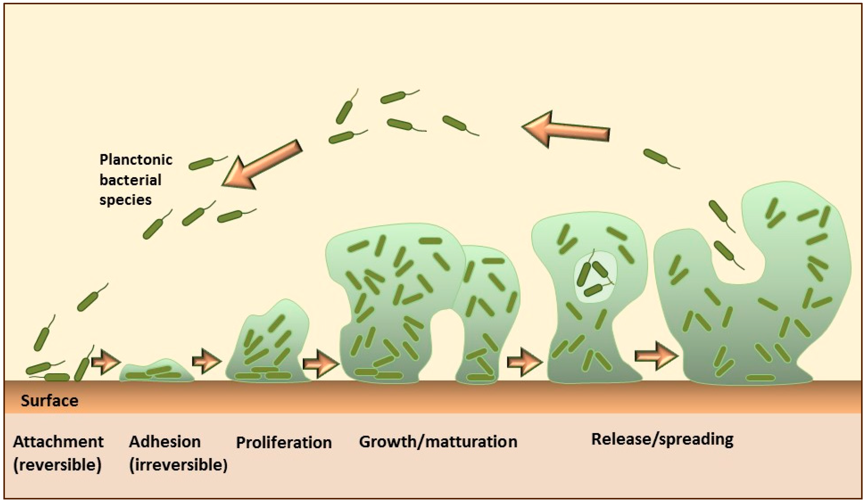 The formation of the biofilm on solid surfaces is a step-wise process comprising several stages (Figure 1). It starts with the conditioning of the surface through the coating with macromolecules from the aqueous surrounding, which enables initial reversible adhesion of microorganisms. The next step is a formation of stronger, irreversible attachments to the surface, followed by the proliferation and aggregation of microorganisms into multicellular and multilayered clusters, which actively produce extracellular matrix. Some cells in the mature biofilms continuously detach and separate from the aggregates, representing a continuous source of planktonic bacteria that can subsequently spread and form new microcolonies [2]. Both the growth and the maturation into a differentiated biofilm, as well as maintenance of such highly organized communities are regulated through the intercellular communication via molecular chemical signals, also known as quorum sensing (QS) [3]. QS affects the cell density, gene expression, resistance to stress, virulence factor production and other cellular functions in the biofilm [4,5].