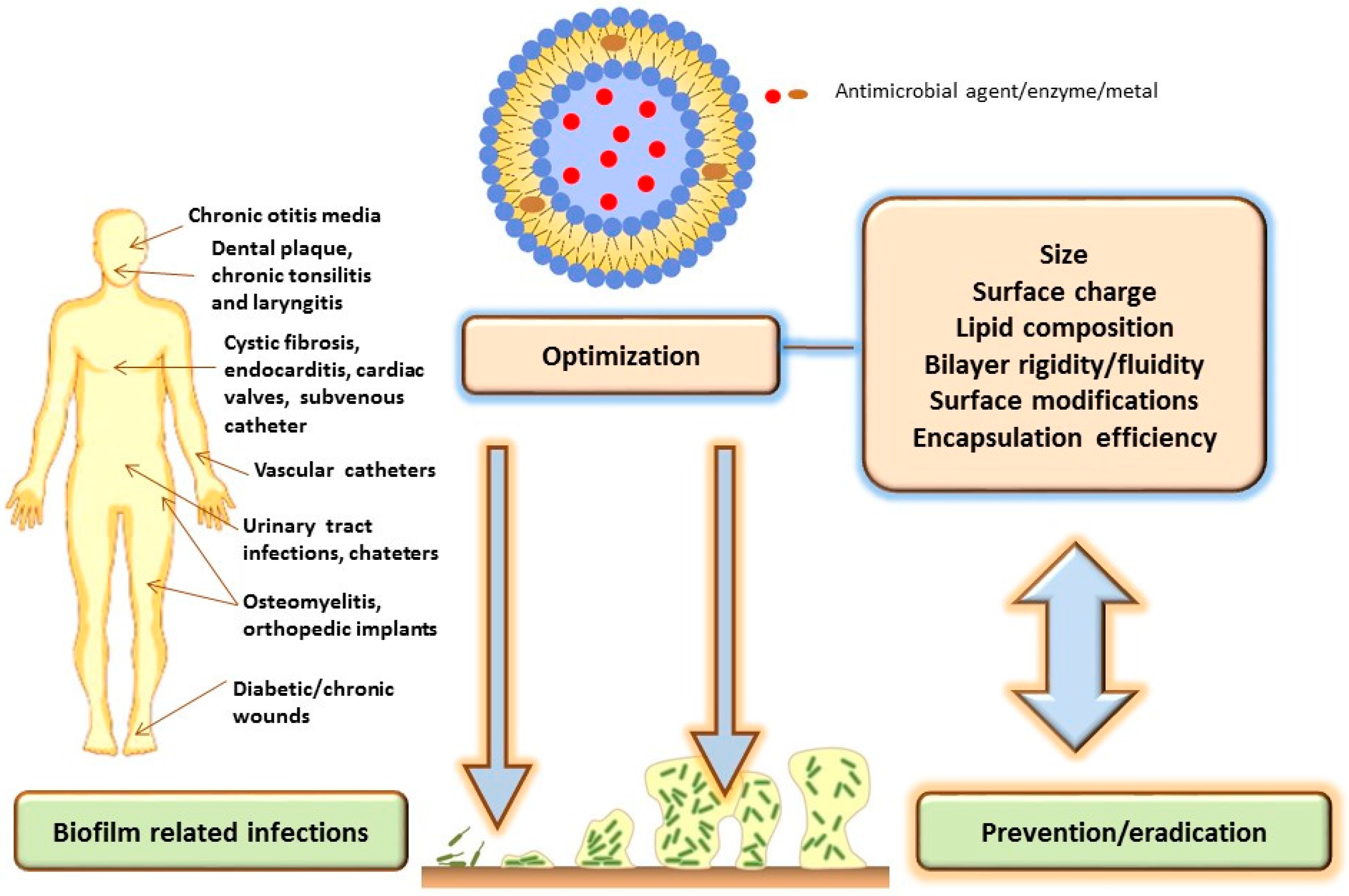 One of the strategies proposed to combat biofilm related infections is the use of surface-modified liposomes such as poly(ethylene) glycol (PEG)-derived liposomes (PEGylated liposomes), immunoliposomes, lectin-coated liposomes and mannosylated liposomes.