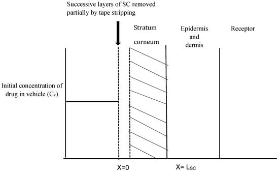 where A is the area being tape stripped and xn is at the center of msc,n. For this purpose, the density of the SC was assumed to be 1 g/cm3 [] and the area of tape stripping was calculated to be 4 cm2. It was assumed that the process of tape stripping removed the entire SC. The thickness of the SC (Lsc) was determined by Equation (3) of []