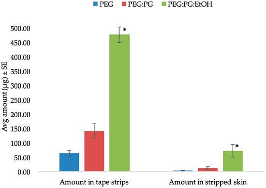 Amount of SN in tape strips and stripped skin using different vehicles (* indicates statistically significant compared to PEG and PEG:PG (p < 0.05)).