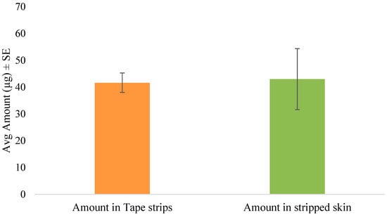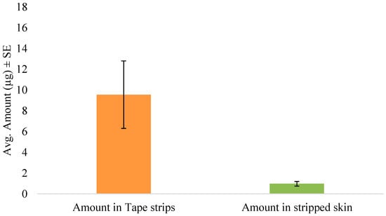 The tape stripping method was used to determine the amount of SN in the skin following in vitro permeation. In the preliminary diffusion study, the inclusion of anhydrous ethanol significantly enhanced the skin retention of the drug as seen in Figure 2. Hence, the formulation was then optimized and used for further studies in the form of an anhydrous gel. After 5 min of formulation application of the gel, the skin was tape stripped immediately to simulate unsteady-state conditions. The amount of drug in the tape strips and stripped skin are shown in Figure 3. Thus, after immediate administration of the formulation, the drug had already distributed in the skin. Similarly, tape stripping was performed after 24 h to represent steady-state conditions and the results are shown in Figure 4.