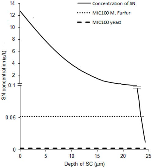 Simulated SN concentration across the SC plotted along with MIC100 of M. furfur and yeast.