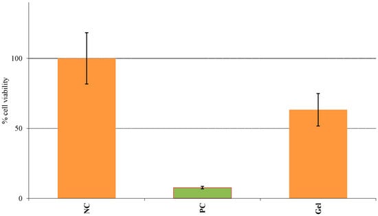 In addition to the therapeutic outcome, an excellent safety profile is an integral part of any topical therapy. Skin irritation can have a significant influence on therapeutic effectiveness and may result in adverse reactions. SN has already been well established as safe and non-toxic in the treatment of fungal infections [,]. In some cases, the cause of skin irritation may be the vehicle and not the drug itself. Since the gel contained a large percentage of ethanol, the final step of our study involved evaluating the irritation potential of the formulation. Conventional irritation testing involves the use of the Draize test which may cause severe pain and suffering in animals, depending on the irritation produced by the specific agent. This method was subsequently banned by ECVAM and has been replaced by validated in vitro human epidermal models. The Epiderm™ model consists of three-dimensional human epidermal keratinocytes comprised of an intact basal layer along the SC and viable epidermis. As per the given protocol, any formulation showing less than 50% cell viability following the MTT assay can be considered an irritant. As seen in Figure 7, since the percentage cell viability of the anhydrous gel was greater than 50% similar to the NC, the formulation can be classified as non-toxic and non-irritant [].