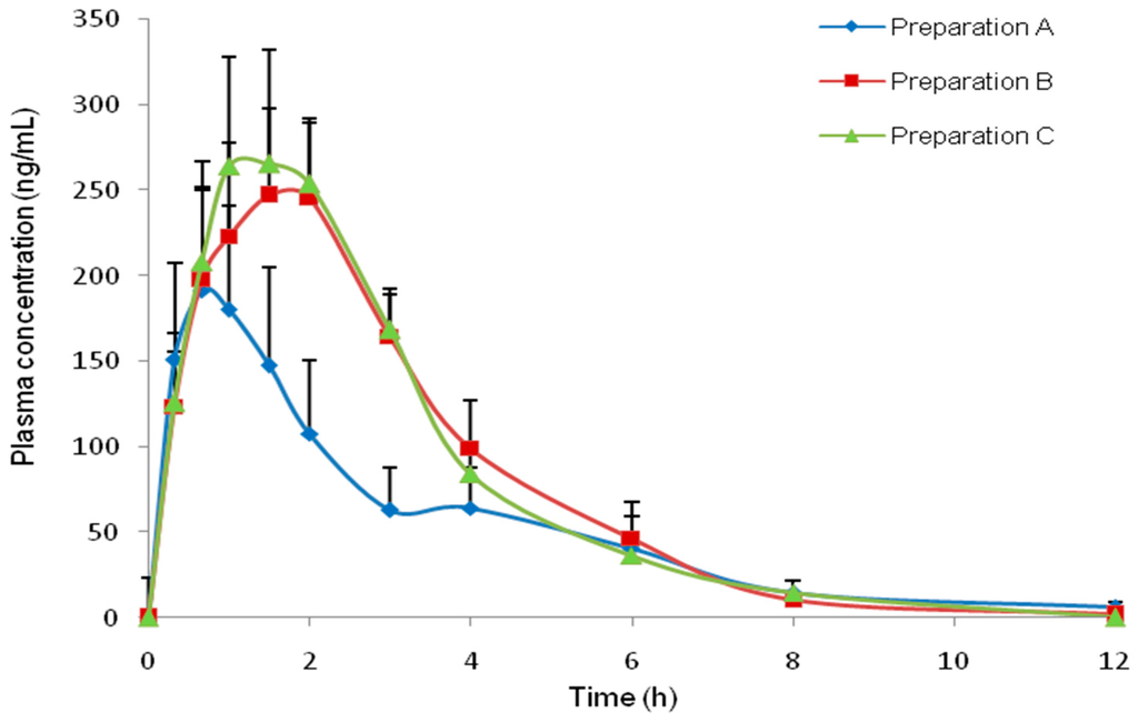 The 90% confidence interval of the ratios of AUC0–t, and Cmax values of preparation B over those of preparation A as well as the ratios of liposomal preparation C over those of the other two preparations A and B are shown in Table 6. It is apparent from the table that at 90% confidence level, the extent of bioavailability of preparation B was about 2.6–3.0 times higher than that of preparation A. Whilst, the extent of bioavailability of liposomal preparation C was about 2.9–3.3 times higher than that of preparation A and 1.0–1.2 times higher when compared to that of preparation B at a 90% confidence level. As for the Cmax values, the 90% confidence interval showed that the maximum concentration achieved with the liposomal preparation B was 2.7–2.8 times higher than that of preparation A. Besides that, the 90% confidence interval also showed that the maximum concentration achieved with the liposomal preparation C was 2.9–3.0 times higher than that of preparation A and 1.0–1.1 times compared to that of preparation B. In the case of the parameter Tmax, no statistical significant difference (p > 0.05) was found among the Tmax values of all three preparations. This suggests that the liposomal preparations of smaller particle sizes (<400 nm, prepared by FTS and MS method) only increase the rate of absorption but not the duration of absorption. In all cases, the duration of absorption was quite short as indicated by the Tmax values.