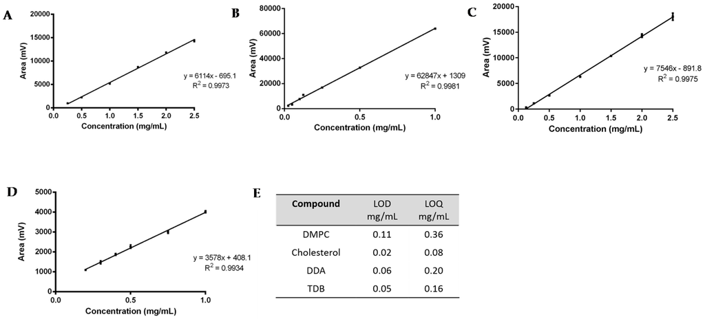 Linearity assessment of (A) DMPC (0.25 to 2.5 mg); (B) Cholesterol (0.025 to 1 mg); (C) DDA (0.125 to 2.5 mg); and (D) TDB (0.2 to 1 mg). The LOD and LOQ for each lipid is shown in (E). Results represent mean ± SD of triplicate measurements (n = 3).