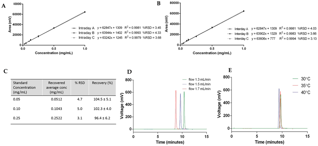 Cholesterol quantification case study: (A) intraday variability; (B) interday variability; (C) accuracy; and robustness with (D) flow rate and (E) temperature.
