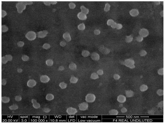 Asantewaa et al., noted that conjugate F3 adsorbed the highest amount of glucose [25], as was the case in a preliminary investigation. Consequently, this conjugate was used to formulate insulin-containing nanoparticles in the present study and labelled as F3PN. These nanoparticles had z-average of 140 ± 12.8 nm, a zeta potential of +19.1 ± 0.69 mV and a pdi of 0.17 ± 0.1. The average diameter of the particles is fairly small and the formulation reasonably homogenous (as indicated by the pdi value). However, the zeta potential is rather low and this can be attributed to the consumption of the –NH3+ groups in chitosan during conjugation with boronic acid. Nanoparticles with a surface charge of |10| mV are considered approximately neutral, while nanoparticles with zeta potentials of at least |30| mV are considered strongly ionic, thereby ensuring sufficient repulsive forces to keep the particles apart [29]. Notwithstanding, F3PN appear to be well separated from each other as shown in the FESEM image in Figure 1. The particles also appear spherical and in agreement with the z-average determination.