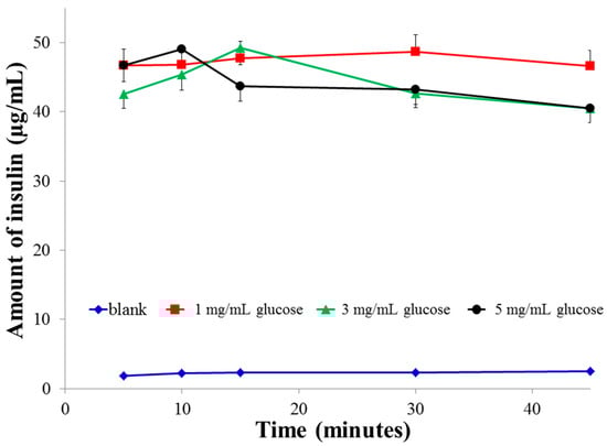 The above data correlates with the size changes in various glucose media (Figure 3) where we observe that the size of the particles in 1 mg/mL glucose is largest initially, but then almost levels off after 20 min. In contrast, the size of the particles continues to increase in 3 mg/mL glucose. In 5 mg/mL glucose, the particles remain the smallest after 60 min (significant; p < 0.025, when compared to both 1 and 3 mg/mL glucose). This alludes to the possible formation of crosslinking between glucose and boronic acid-conjugated chitosan. The extent and rate of this crosslinking is concentration-dependent and thus explains the fall in insulin release from the nanoparticles in 5 mg/mL glucose (Figure 2). Finally, in the absence of glucose media (blank), there was no trigger for drug release and the nominal amount of insulin released was mainly driven by diffusion forces from the matrix to the medium.