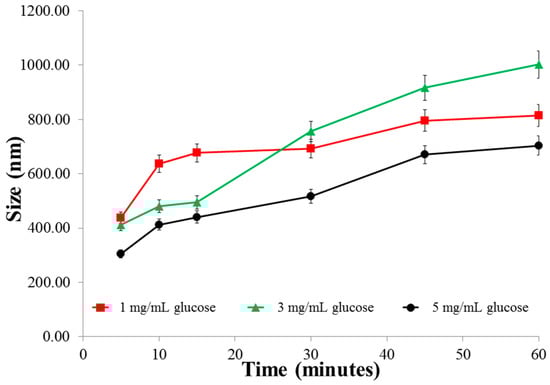 Size changes of the nanoparticles in various concentrations of glucose as a function of time.