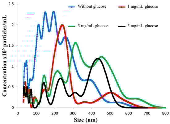 Particle size distribution of F3PN nanoparticles in various concentrations of glucose.