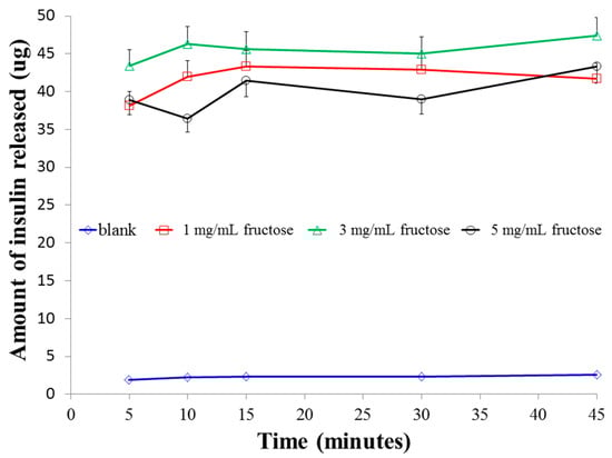 Size analysis of the particles in the various fructose media (Figure 6) indicates that in 1 mg/mL of fructose solution, the size of the particles remained almost unchanged, probably due to the fact that in this concentration, an insignificant number of fructose molecules are available for interaction with the boronic acids. Therefore, the amount of insulin released is also largely sustained. In 3 mg/mL, there is an increase in the size of the particles after 10 min and no further increase thereafter. Whist there was no marked change in the size of the particles in 5 mg/mL fructose over the duration of the experiment, the nanoparticles in this concentration of fructose was significantly smaller (p < 0.025) than those in 1 and 3 mg/mL fructose. This can be attributed to the strong bidentate interactions between fructose and boronic acid, resulting in the formation of very strong crosslinks within the chitosan polymer chains. This effect resulted in a limited amount of insulin release as presented earlier (Figure 5). Similar to the observation in glucose media (Figure 2), in the absence of fructose media, there was very little release of insulin (less than 3 µg) from F3PNin 45 min.