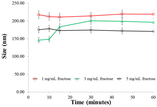 Size changes of the nanoparticles in various concentrations of fructose as a function of time.