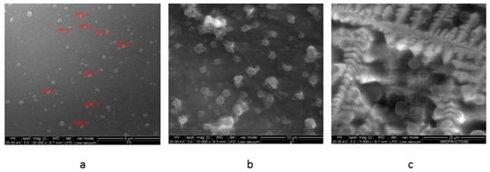 Figure 7a depicts the FESEM image of freshly prepared F3PN nanoparticles loaded with insulin, which appear spherical and uniformly distributed. When the particles were exposed to glucose (Figure 7b), they deformed and aggregated. This appearance is accredited to the non-specific binding nature of glucose to the boronic acid moieties within the chitosan matrix. In this context, it is possible for glucose in its α-d-glucofuranose form, to bind with a pair of OH groups at 1, 2 position [24]. It is also possible for each of the OH groups at positions 3, 5 and 6 of the sugar to bind with one pair of OH groups in boronic acid. We believe that this non-specificity of glucose interaction with boronic acid leads to the formation of distorted crosslinks. Therefore, we observed an initial increase in the nanoparticle size at lower glucose concentrations, which resulted in increased insulin release. However, at higher concentrations of glucose, the release of insulin is slowed by the formation of relatively stronger crosslinks by virtue of the number of the crosslinks mainly. On the other hand, in fructose solution (Figure 7c), we observe that the particles retained their more spherical morphology compared to the nanoparticles in the glucose solution and surrounded by a plethora of crystallized fructose. The binding constant of fructose to boronic acid is significantly higher (4370 M−1) than that of glucose (110 M−1). Binding between two multivalent (i.e., having more than one binding site) entities involving n (n > 1) binding events occurs with an affinity higher than the sum of n individual monovalent interactions. Most sensing studies using boronic acid have identified fructose as a monovalent ligand with boronic acids binding to its β-d-fructofuranose form [24]. This configuration provides more possibilities for bidentate interactions between the –OH groups of boronic acid with those of fructose. Therefore, the crosslinking within the nanoparticles resulting from these interactions is more regular.