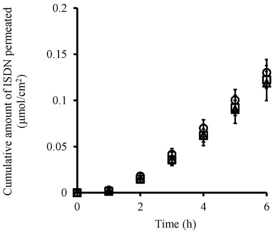 Time course of the cumulative amount of ISDN that permeated through pig ear skin from its solution. pH 3.0 (○), pH 7.4 (△) and pH 10.0 (□). Each point represents the mean ± S.E. (n = 3–4).