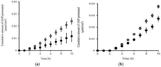 Figure 3a,b show the effect of hair follicle plugging on the skin permeation of ionized and non-ionized AMP, respectively. The cumulative amount of ionized AMP (at pH 3.0) that permeated through the plugged skin was about half of that through the non-plugged skin (Figure 3a). On the other hand, the cumulative amount of non-ionized AMP (at pH 7.4) that permeated through the plugged skin was about 0.7-fold that through the non-plugged skin (Figure 3b). The sizes of these decreases in the cumulative amount of AMP that permeated were greatly affected by the ratio of ionized to non-ionized forms. Table 3 shows permeation parameters calculated from the skin permeation profiles shown in Figure 3. These parameters can be utilized to evaluate the changes in distribution and/or diffusion of topically applied or exposed chemicals to and across the skin [8,36]. The KL values obtained through the hair follicle plugging were decreased at both pH 3.0 and pH 7.4 compared with those of non-plugged skin, although the DL−2 values were almost the same. These decreased KL values at both pH 3.0 and pH 7.4 corresponded to the sizes of the decreases in the cumulative amount of AMP that permeated through the plugged skin compared with the non-plugged skin.