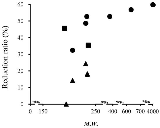 Relationship between the reduction ratio of skin permeation by hair follicle plugging and the molecular weight of the chemicals. ●: ionized form (acidic or basic) chemicals; ▲: non-ionized form (acidic or basic) chemicals; ■: neutral chemicals.