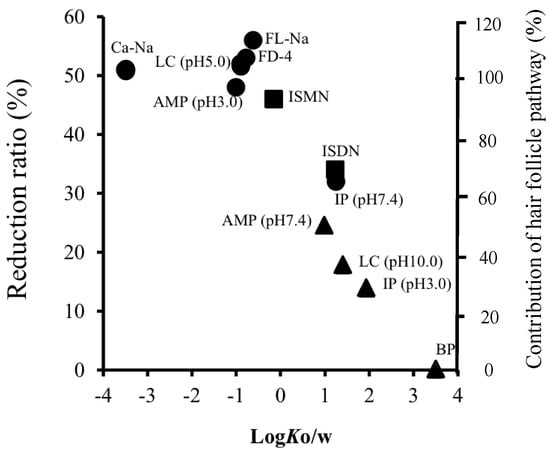 Relationship between the reduction ratio by hair follicle plugging or the contribution of skin permeation pathway and the partition coefficient of the chemicals. ●: ionized form (acidic or basic) chemicals; ▲: non-ionized form (acidic or basic) chemicals; ■: neutral chemicals.