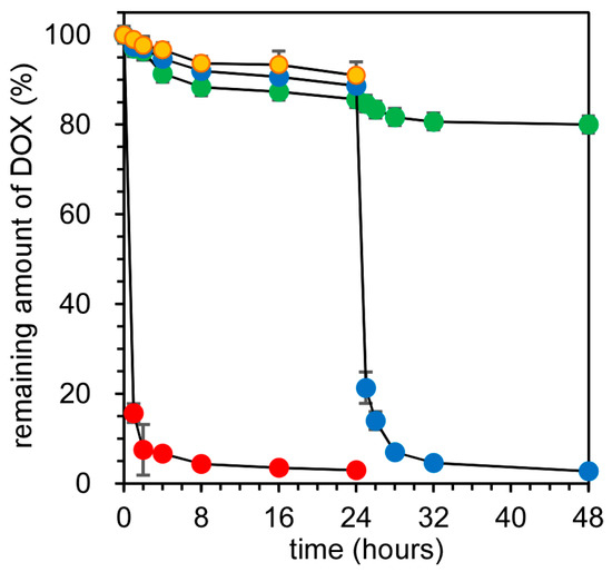 The release of DOX molecules from nanocapsules was evaluated by the dialysis method. Samples of 3.0 mL were placed into a dialysis cassette (Slide-A-Lyzer Dialysis Cassette, Thermo Scientific, Rockford, IL, USA) with MWCO 10,000, and the dialysis cassettes were immersed in 1.0 L of PBS including 10 μM of GSH at 37 °C. The concentration of GSH in the outer medium was increased to 0.5 mM after 24 h. One hundred microliter samples were collected from the dialysis cassette at predetermined times, and the absorbance at 485 nm was measured using a V-550 UV/Vis spectrophotometer (JASCO, Tokyo, Japan). The remaining amount of DOX in the dialysis cassettes was calculated using calibration curves of DOX in PBS.