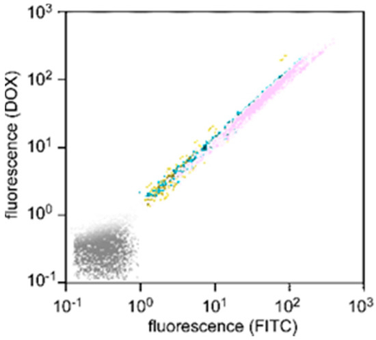 Time dependence of cellular uptake of DOX-loaded SS-bonded nanocapsules that were covalently labeled with fluorescein isothiocyanate (FITC). Control (without treatment): gray points; 1 h: yellow points; 2 h: green points; 4 h: blue points; 8 h: pink points.