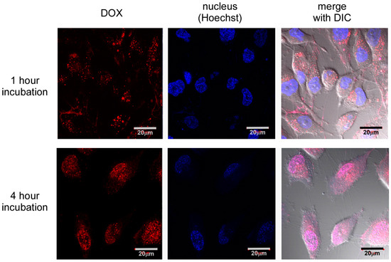 Further, intracellular distribution of DOX was confirmed by laser confocal microscopic observation (Figure 4). There was a significant difference in the intracellular distribution of DOX between 1 and 4 h incubation time. After 1 h of incubation, the DOX fluorescence did not distribute into the nucleus, although red fluorescence dots were observed in the cells. Since free DOX molecules can distribute into the nucleus spontaneously [26,27], this suggests that DOX molecules were not release from nanocapsules, and DOX-loaded nanocapsules were mainly located in endosomes. In contrast, DOX red fluorescence overlapped with Hoechst blue fluorescence after 4 h of incubation, demonstrating DOX molecules were distributed in the nucleus. This change in intracellular distribution of DOX between 1 and 4 h of incubation indicates successful delivery of DOX into the cytoplasm. In this time period, DOX-loaded SS-bonded nanocapsules can escape from the endosome by the buffering effect of tertiary amines in the interior of the PAMAM dendron, and DOX molecules are released through the collapse of nanocapsules by the cleavage of SS bonds in response to the high GSH concentration. That is, these results indicate that pH and redox dual responsibilities of SS-bonded nanocapsules can work in cultured cells.