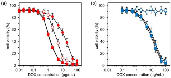 Two types of hollow nanocapsules, SS-bonded and X-linked nanocapsules, were prepared by stabilizing PAMAM dendron-PLL self-assembled polymer vesicles using an IT or EGDE in a MeOH/H2O mixture (80 vol % MeOH). Hollow nanocapsules were observed in TEM observation (Figure 1). DOX was loaded into the nanocapsules by mixing in MeOH/H2O (80 vol % MeOH). The LC and LE of the DOX, mean diameter, and polydispersity index (PDI) of DOX-loaded nanocapsules before and after DOX loading are summarized in Table 1. There was no significant difference in LC and LE between SS-bonded and X-linked nanocapsules, and their LC and LE were ca. 4% and ca. 8%, respectively. Additionally, the mean diameter and PDI of the nanocapsules were not influenced by DOX loading, and both nanocapsules had a mean diameter of ca. 200 nm with a narrow distribution (less than 0.1 of PDI). For confirming the effect of the electrostatic barrier of the nanocapsules against the leakage of loaded DOX, the release of DOX from SS-bonded and X-linked nanocapsules was evaluated by the dialysis method. In this experiment, GSH concentrations of the outer medium were increased at 24 h incubation from 10 μM to 0.5 mM, which correspond to extra- and intra-cellular GSH concentrations, respectively [23,24,25]. Figure 2 show the release profiles of DOX from SS-bonded and X-linked nanocapsules. At the extracellular GSH concentration (10 μM), the release rates of DOX from both SS-bonded and X-linked nanocapsules were very slow, and ca. 90% of DOX remained in the nanocapsules after 24 h of incubation. Additionally, DOX from SS-bonded nanocapsules was observed at endosomal pH (pH 5.5). Such a slow release is due to the effect of the electrostatic barrier of the cationic PLL membrane. We have previously compared the release of cationic and anionic fluorescence dyes (rhodamine 6G and fluorescein) from SS-bonded and X-linked nanocapsules. Although anionic fluorescein molecules are gradually released, cationic rhodamine 6G showed almost no release from the nanocapsules because of the electrostatic SS-bonded PLL membrane in the nanocapsules, in which cationic rhodamine 6G could not distribute into the cationic PLL membrane and diffuse into the outer medium. DOX has a primary amine with a pKa 8.3 [21,22] and the protonated DOX/non-protonated DOX ratio is theoretically 8:1 at pH 7.4. Due to the cationic nature of DOX at pH 7.4, the DOX release from nanocapsules was very slow, as shown in Figure 2. When the GSH concentration of the outer medium increased to 0.5 mM after 24 h of incubation, DOX molecules were immediately released only from SS-bonded nanocapsules. The release rate of DOX in SS-bonded nanocapsules after 24 h of incubation and in the presence of 0.5 mM GSH is comparable with that of free DOX, suggesting that DOX molecules are released readily from nanocapsules in response to a high GSH concentration. On the other hand, the increase in GSH concentration in the outer medium had no influence to DOX release from X-linked nanocapsules. There was a critical GSH concentration for the collapse of SS-bonded nanocapsules between 20 and 50 μM [20]. By increasing the GSH concentration to an intracellular level, which is over the critical GSH concentration, SS-bonded nanocapsules were destabilized through dissociation of the SS bonds between PLL tails, and then, DOX release from the nanocapsules was immediate. Thus, SS-bonded nanocapsules can effectively release DOX molecules under the reductive conditions of the cytoplasm.