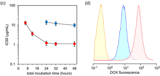Anticancer effect of free DOX and DOX in SS-bonded nanocapsules to HeLa cells. The change in cell viabilities with different DOX concentrations and incubation periods for free DOX (a) and DOX in SS-bonded nanocapsules (b); Incubation time dependence of IC50 values for free DOX and DOX in SS-bonded nanocapsules (c); Fluorescence distribution of HeLa cells treated with free DOX and DOX in SS-bonded nanocapsules for 4 h (d). In (a,b), the plots for 6, 12, 24, 32, and 48 h total incubation are represented by closed circles, open circles, closed triangles, open triangles, and closed squares, respectively. The data are the average of three experiments ± SD. In (c), free DOX and DOX in SS-bonded nanocapsules are represented by red and blue plots, respectively. In (d), free DOX, DOX in SS-bonded nanocapsules and control (without treatment) are represented by red, blue, and yellow distributions.