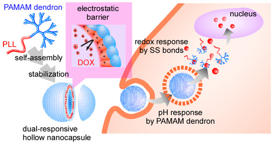 The pH and redox dual responsive hollow nanocapsules were prepared through the stabilization of PAMAM dendron-PLL self-assembled polymer vesicles by introducing SS bond linkages between PLLs, in which tertiary amines in the interior of the PAMAM dendron exhibit a buffering effect for regulating endosomal escape. SS-bonded nanocapsules effectively inhibit the release of DOX because of the electrostatic barrier of the SS-bonded PLL membrane. This SS-bonded PLL membrane is stable under the extracellular GSH concentration and 90% DOX molecules are maintained in the nanocapsules even after 24 h of incubation. DOX molecules are released from nanocapsules in response to a rise in the intracellular GSH concentration, since SS bonds are cleaved at the intracellular GSH concentration. The PAMAM dendron also showed a buffering effect for endosomal escape, and SS-bonded nanocapsules delivered DOX molecules into the cytoplasm through a smooth release in response to the intracellular GSH concentration. The in vitro anticancer effect of DOX in SS-bonded nanocapsules was similar or more effective when compared with that of free DOX. Thus, the pH and redox dual responsive hollow nanocapsules, which were prepared from PAMAM dendron-PLL self-assembled polymer vesicles bearing an electrostatic barrier, are suitable for the delivery of cationic molecules into the cytoplasm.