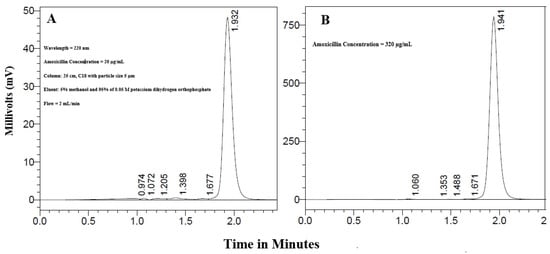 (A) Absorption peaks obtained for amoxicillin concentrations 20 µg/mL and (B) 320 µg/mL using HPLC.