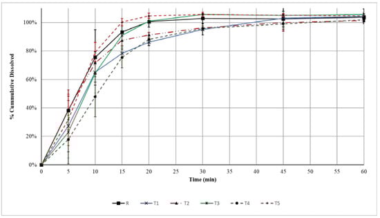 The dissolution of amoxicillin from different products was rapid with the release of more than 85% of the labeled amount within 15 to 20 min (see Figure 2). As such, the products would pass the dissolution test standard in accordance with the USP requirement for amoxicillin tablets (i.e., Q ≥ 85% at 30 min) []. In fact R, T2, T3, and T5 are considered as very rapidly dissolving since at least 85% of labeled amoxicillin have dissolved in 15 min []. In these cases, similarity factor and difference factor calculations become unnecessary. The dissolution results also indicate that it was unnecessary to extend the dissolution time to 120 min as 60 min would have been sufficient to study the dissolution profiles adequately. The coefficient of variations for drug release at the time points 5 and 10 min were high but did not exceed 20% with any product. For other time points, these were less than 10%.
