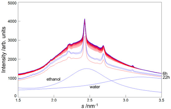 In this paper, we focused our attention on the behavior of the hydrocarbon-chain packing structures. In Figure 1 the X-ray scattering profiles in S = 1.5–3.5 nm−1 for the human SC as a function of time on applying ethanol to the SC are shown. In this figure the initial profile is drawn by a red curve, and successively the profiles changed from red to blue curves with time after applying ethanol to the SC till 11,000 s. Just after 11,000 s, the ethanol solution around the SC was evacuated. After this procedure, to remove ethanol within the treated SC, the sample was exposed to the open air for 22 h; the profiles are shown by blue curves. As shown in Figure 1, in the wide-angle range peaks attributed to the hydrocarbon-chain packing structure were observed at S = 2.4 and 2.7 nm−1. In this figure the X-ray scattering profiles of water and ethanol are drawn as references in the relative scales. On briefly examining the behavior of the profiles in Figure 1, it could be seen that just after pouring ethanol in the sample cell the overall profile shifted upward due to filling ethanol outside the SC sample; following this process the profile gradually shifted upward by taking up ethanol into the SC sample until 11,000 s, when the ethanol solution around the sample was evacuated. After that, by removing the ethanol within the treated SC sample by exposing the sample to the air for a long time, the profile returned to resemble that of the untreated SC sample. Notwithstanding the treated SC sample being exposed to the open air for a long time, the profiles lay slightly upward beyond the original profile before the ethanol treatment. This might be due to the fact that ethanol within the treated SC sample still remained and a longer exposure time resulted in a lower profile. In the following subsections we will analyze in detail the peak intensities that appeared at S = 2.4 and 2.7 nm−1.