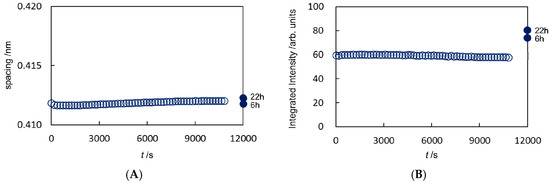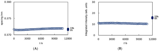 Analyzed results in the stratum corneum treated with ethanol for sample #E1. (A) Change of the spacing of the hydrocarbon-chain packing structure at the lattice constant 0.41 nm and (B) the change in its integrated intensity. The data denoted on the time scale at 12,000 s for convenience were those obtained by removing ethanol from the treated stratum corneum for 6 h and 22 h (hereafter the similar expression is adopted).