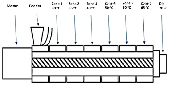 Schematic illustration of the APV twin-screw extruder and extrusion conditions used to compound SSB® 55 pharmaceutical-grade shellac.