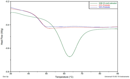 Figure 3 illustrates that the addition of the Biocare® Bifidobacterium Probiotic powder lowers the overall glass transition temperature of the material, indicating an increase in the mobility of the backbone chain. These findings correlate with the observations made during processing as previously outlined, whereby a plasticizing effect was revealed. Interestingly from the thermal analysis, the crystalline structure of the virgin shellac material has a broad melting profile. However, with the addition of the probiotic powder, the thermal profile changed to one more comparable to an amorphous material that is, by increasing the free volume. The shellac matrix in its virgin extruded form had a Tg at 58.51 °C. This transition was reduced to 49.98 and 49.51 °C upon addition of 25% and 50% probiotic powder, respectively.