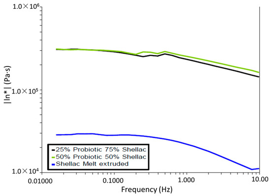 Complex viscosity versus frequency (Hz) curves at 70 °C for SSB® 55 shellac and Biocare® Bifidobacterium Probiotic blends.
