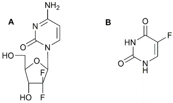 Chemical structure of (A) gemcitabine and (B) 5-fluorouracil.